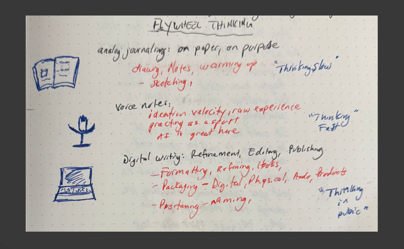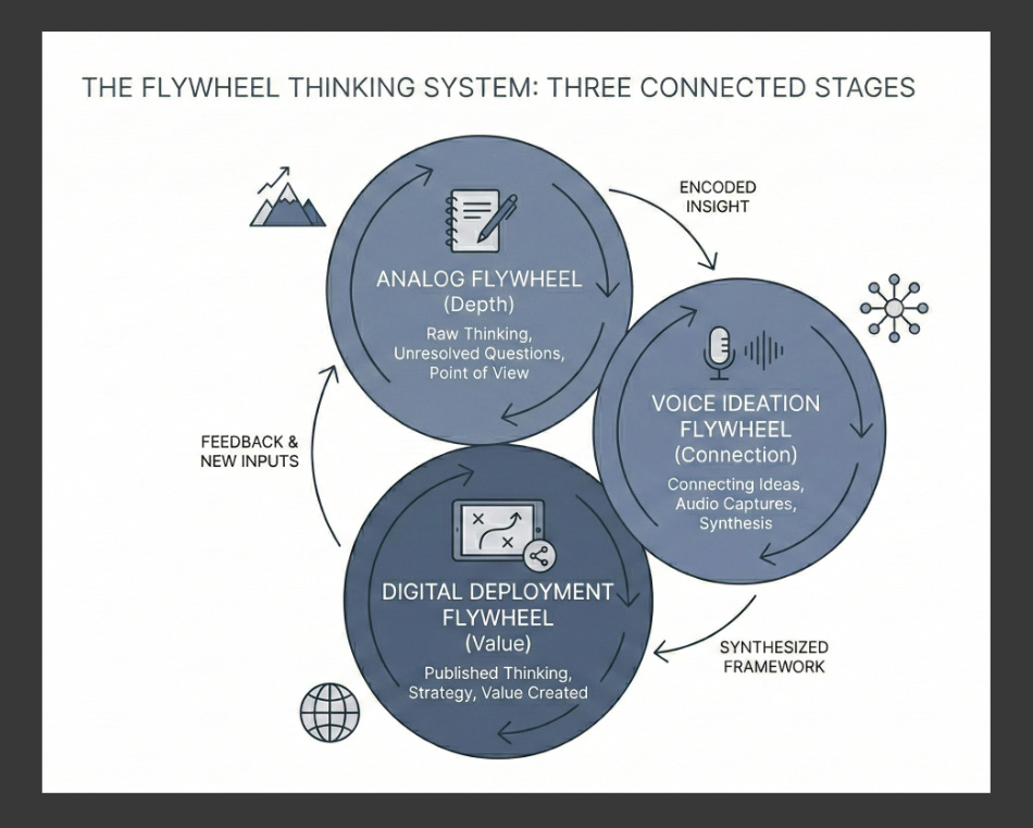 Each flywheel’s output becomes the next one’s input. The analog practice produces raw material. The voice ideation flywheel processes it into connectable ideas. The digital deployment flywheel publishes it into the world. The system feeds itself. The thinking compounds.